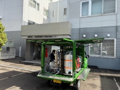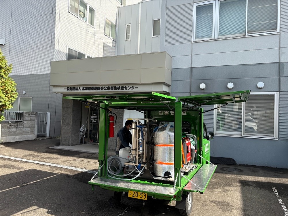 災害支援車LCXの浄水器試験のため、北海道札幌市のモエレ沼の原水を使用し、浄水前後の水質検査を行いました。