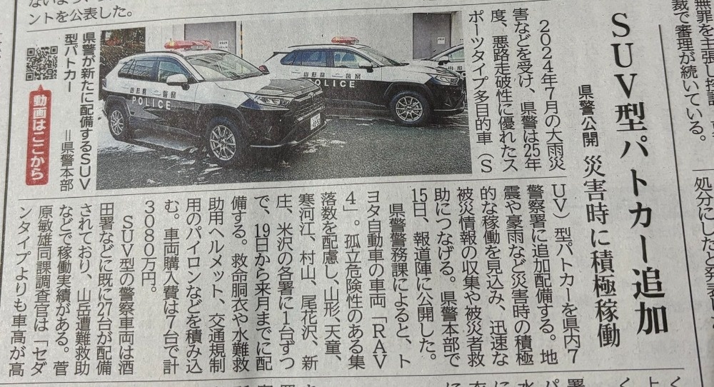 山形県警 SUVパトカー 2026/01/27 新聞・雑誌メディア 掲載 NEW パトカーはこれまで何台も作らせていただきました。 ただし、SUVのパトカーは初めてです。 (山形新聞 掲載より) 事故の他、災害対応の場合は警察官が危険にさらされます。 パトカーもそれらを想定して、これまでのセダン型からSUVに切り替わるように なってきました。 この車両が地域の安全な暮らしを守っていくために、丁寧に仕上げました。