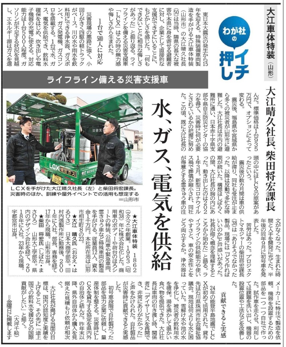 2026年2月13日 山形新聞掲載 2026/02/21 新聞・雑誌メディア 掲載 2026年2月13日(金) 山形新聞 ライフラインを備える災害支援車「LCX」の構想・開発・普及展開のお話を掲載いただきました。 社長・課長で当時の秘話を語っております。 この災害支援車は主に、自治体・県へ納入実績を増やしております。 皆さんの町にも導入になっているかもしれません。 インフラに係る特装車を主業とする当社は、これから国内はもちろん海外ニーズにも対応できるよう精進して参ります。
